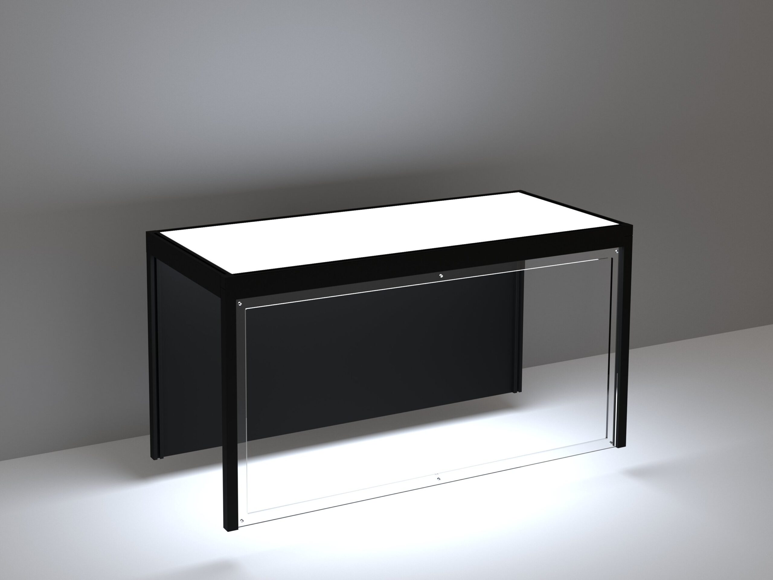 Where are the spotlights I hear you say ? In the White or Black2White versions the display IS the spotlight. The entire shelf and ceiling are a source of dimmable light so your collection is perfectly illuminated. Even the black acrylic plates (top and bottom) become transparent when you put the lights on.